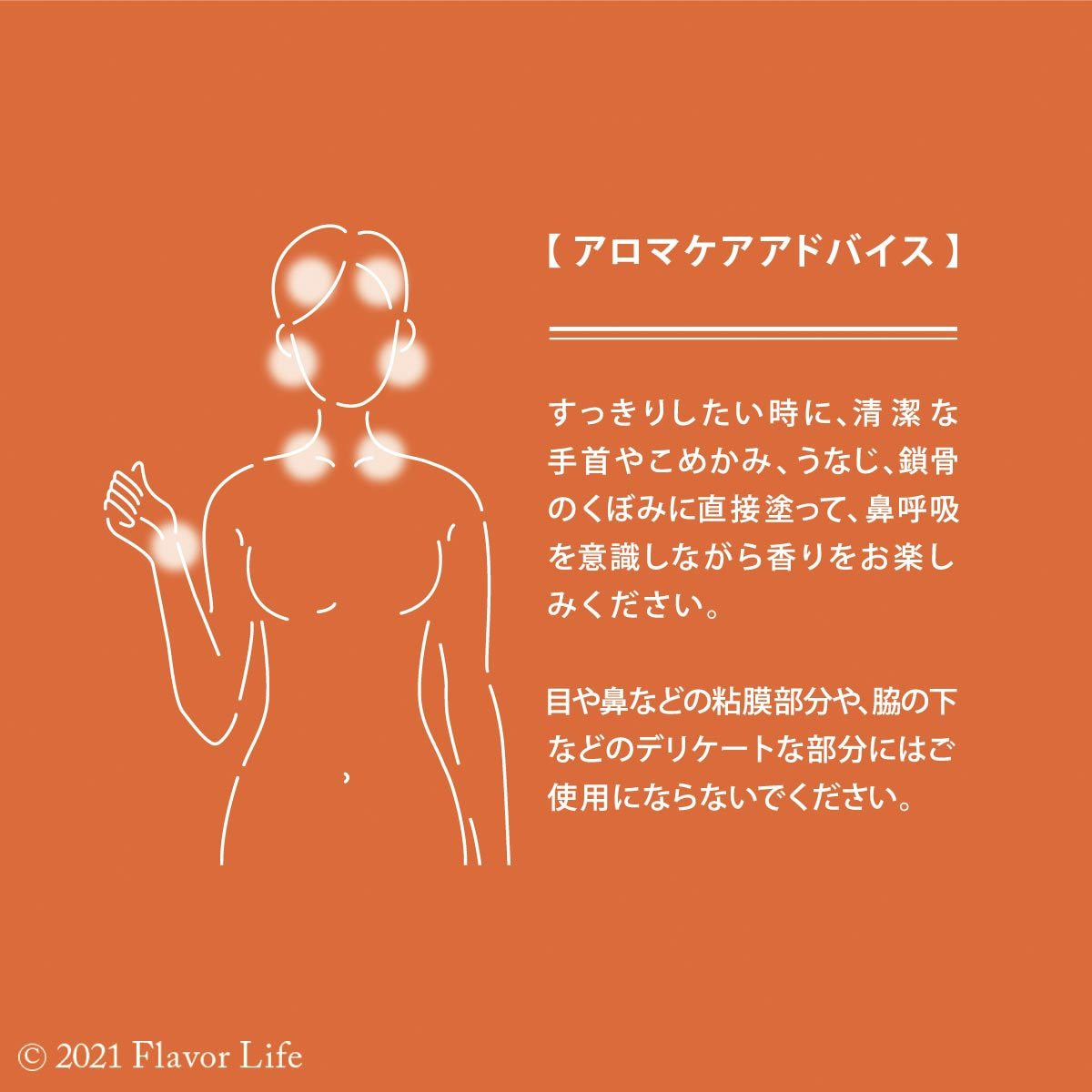 すっきりしたいときに、清潔な手首やこめかみ、うなじ、鎖骨のくぼみに直接塗って、鼻呼吸を意識しながら香りをお楽しみください。