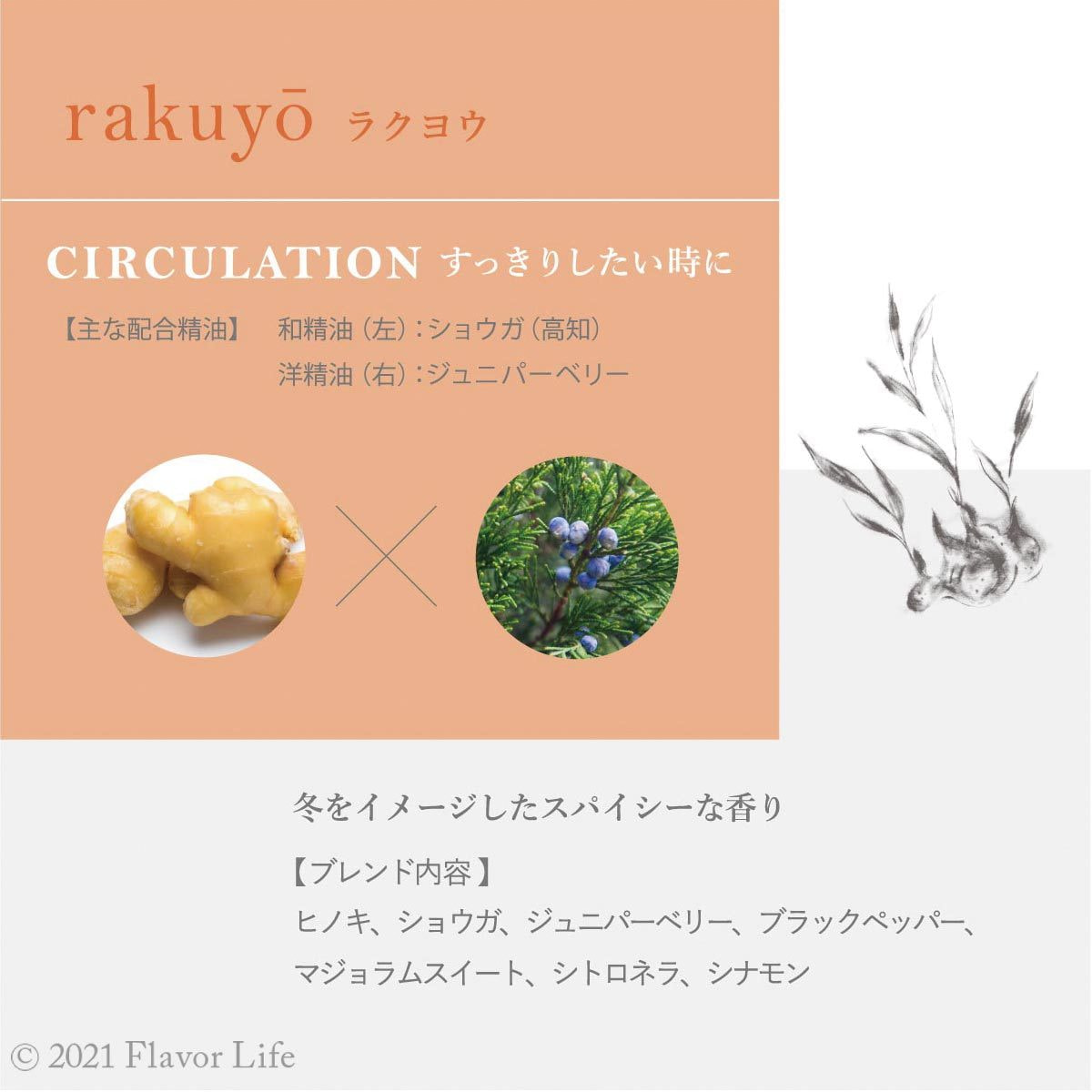 ヒノキ、ショウガ、ジュニパーベリー、ブラックペッパー、マジョラムスイート、シトロネラ、シナモン